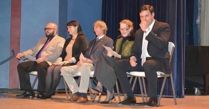 Canton’s board of aldermen/women James Markey (from left), Kristina Smith, Dr. Ralph Hamlett and Gail Mull sit onstage with Mayor Zeb Smathers (far right) at the Colonial Theater in November 2017. Cory Vaillancourt photo