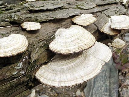 around but become especially apparent during the winter months. Some are shaped like a horse’s hoof, others like a turkey's tail. Some are as large as dinner platters, others as small as your fingernail. Also known as pore fungi, bracket fungi belong to a mushroom family (Polyporaceae) whose members grow attached to decomposing logs and tree trunks. Brackets are quite woody and hardened as compared with most soft-bodied mushrooms. Because of this woody nature they tend to last much longer than other mushrooms, providing the opportunity to observe them from year to year.