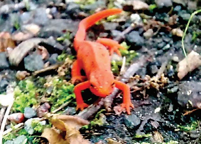 Ioften remind everyone who reads “The Naturalist’s Corner” to remember to look up. But each spring while surveying birds for the Forest Service I am reminded to look down. I have a couple of survey points in the Pisgah National Forest along Locust Creek near the South Toe River that must be red eft mecca. Red eft is the terrestrial stage of eastern or red-spotted newt (Notophthalmus viridescens.)