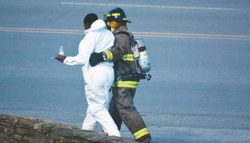 A firefighter tends to a “victim” during last week’s disaster simulation drill in Canton. Cory Vaillancourt photo