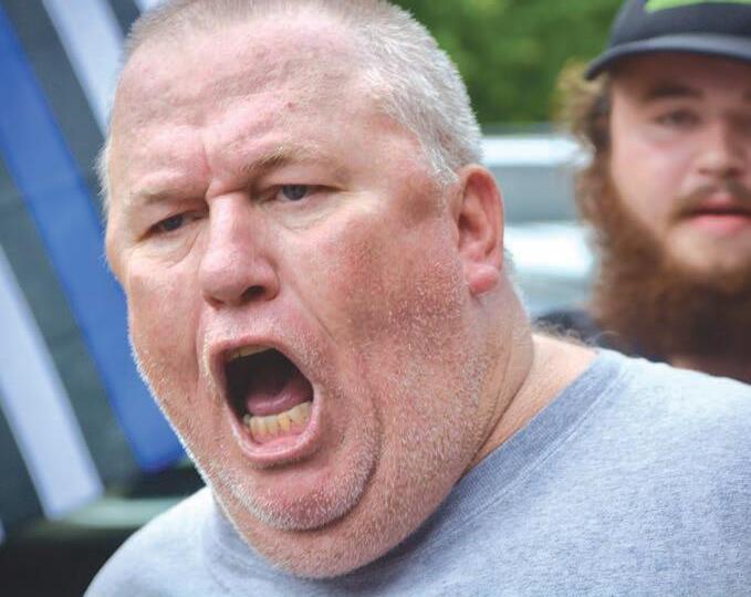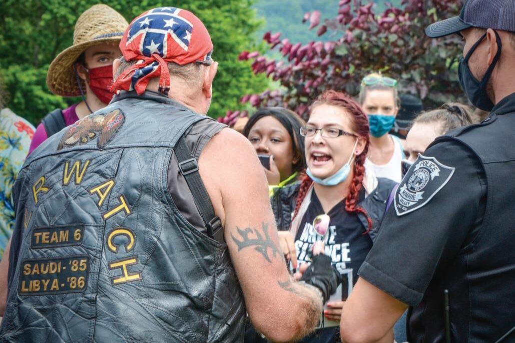 A counter demonstrator who gave his name as Todd Barone addresses BLM protestors in Maggie Valley on July 18. Cory Vaillancourt photo