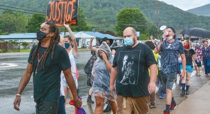 As a torrential downpour took shape, Davis and about 30 others began their march from Town Hall up the sidewalk on Soco Road, with Maggie Valley Police Department officers in tow.