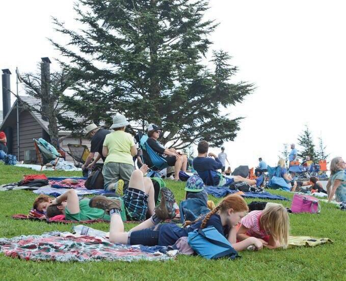belied its impending disappearance. The roads remained miraculously clear all the way to the media parking lot on Clingmans Dome Road, and even at eight-something in the morning the place was abuzz with ticketholders and park staff. Before long, beach blankets, hammocks and fold-up chairs covered the sidewalks and grassy spots of the parking-area-turned-event-center, every conversation full of anticipation of the solar event to come and worry, accentuated by necks craned upward, that the clouds flirting with the sky could eclipse the eclipse.