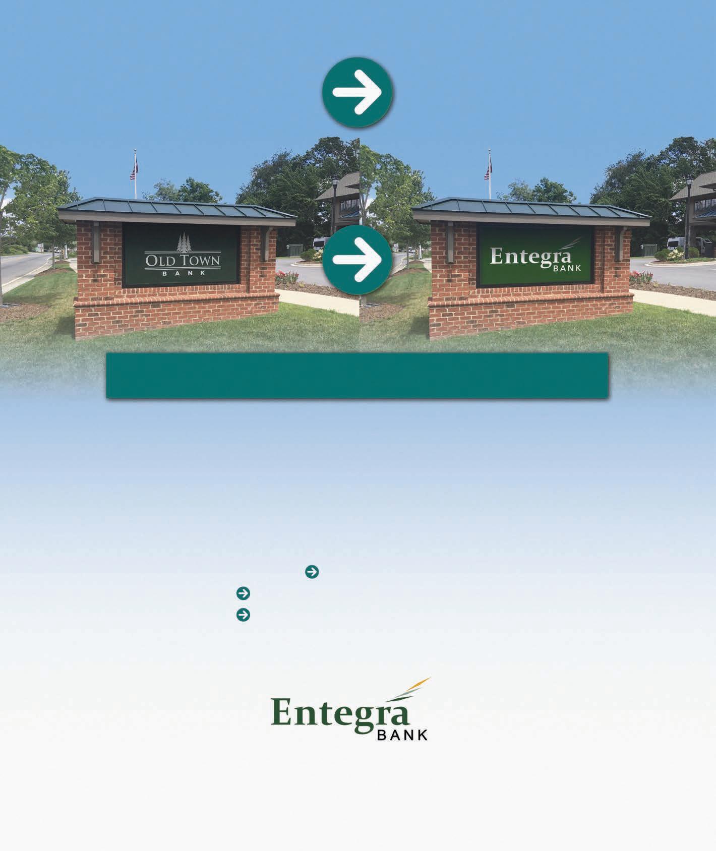 When our doors open on Monday, August 29th, the conversion of Old Town Bank systems to Entegra Bank will be complete. There will be a new name - Entegra Bank - on the outside.