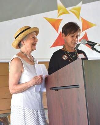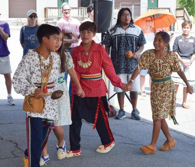 Cherokee children lead a traditional friendship dance at the Nikwasi Mound in Franklin. Barbara McRae (below, left) and Juanita Wilson, co-chairs of the Nikwasi Initiative, give the opening prayer in English and Cherokee. Jessi Stone photos