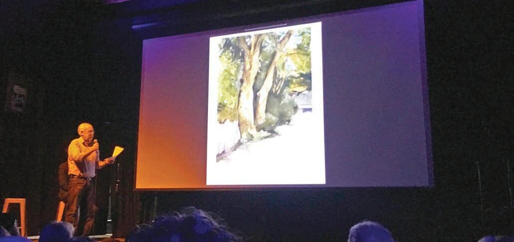 Kenneth Frazelle explains the synesthetic connection between his music and his paintings during a presentation Sept. 13