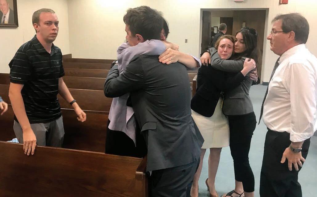 Cody Jenkins and his mother hug after the not guilty verdict is delivered while his father stands to the right and his girlfriend Macy hugs Steph Lay, Frank Lay’s wife and paralegal. Donated photo
