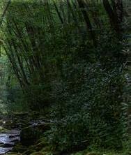 At about half a mile above its trailhead, the KPT passes through a thicket of rosebay rhododendron and crosses a footbridge over Kephart Prong. Alongside the trail, several hundred yards up the slope from this bridge,
