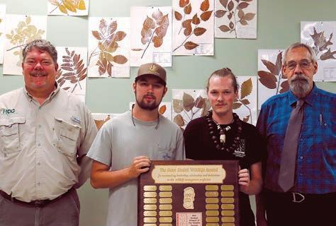 plants that indicate human activity on a large scale. About a quarter mile above the trailhead, you’ll commence spotting large boxwoods and a stand of arborvitae. Company 441 of the Civilian Conservation Corps was stationed here from 1933 to 1942. An old pump, a low stone wall, a masonry “message board,” a hearth, pieces of pipe, and a 20foot-high chimney are just some of the material evidence left over from those long-ago days.