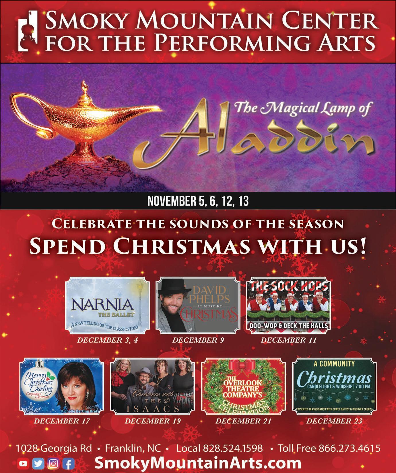 • “The Magical Lamp of Aladdin” will hit the stage at 7 p.m. Nov. 5-6, 12-13 and 2 p.m. Nov. 6 and 13 at the Smoky Mountain Center for the Performing Arts in Franklin. Tickets are $13 per person. For more information and/or to purchase tickets, click on smokymountainarts.com.