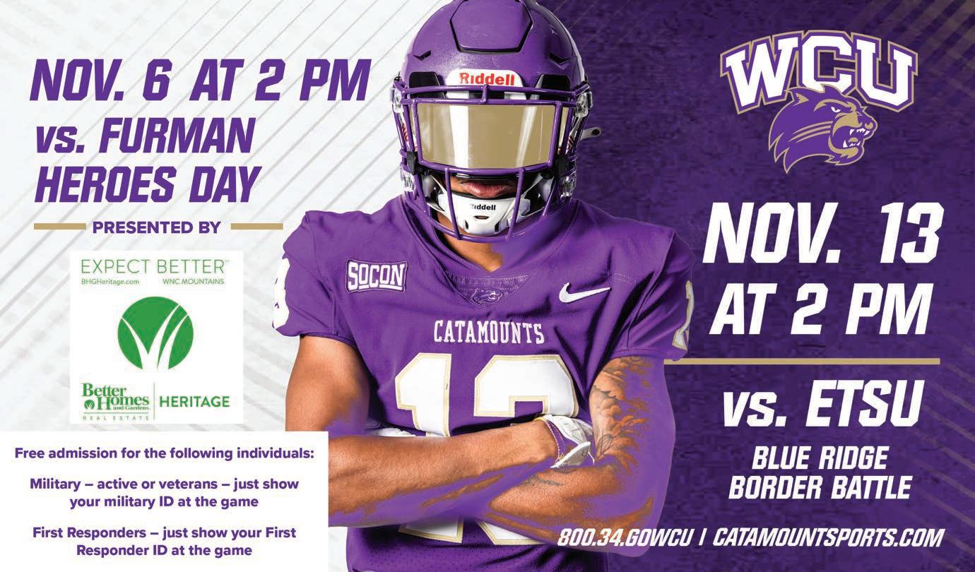 • The Jackson County Veterans Day Parade will be held on Thursday, Nov. 11, on Main Street in Sylva. Line up will begin at 2 p.m. at Mark Watson Park and the parade will begin at 3 p.m. 828.631.2231.