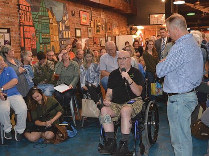 Clark Williams, owner of Frog Level Brewing, asks a question during a public forum held at the brewery to discuss the growing homelessness issue in Haywood County. Jessi Stone photo