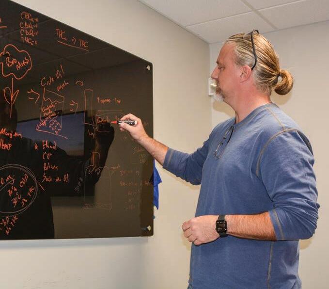 Back to Miller’s etchings on the blackboard — Abundant Labs receives hemp biomass at its facility from different growers and uses it to make a specific product for a client, which will either be a full spectrum extract or a CBD isolate from the plant. This is where it gets a little confusing for people, but first you have to understand the many components of the hemp plant. The hemp flower is made up of hundreds of cannabinoids, though their focus is on the big ones — CBD, CBG and CBN. THC is also a cannabinoid that’s in the plant and one of the main ones Abundant Labs is asked to extract from the plant before creating the final product for a client.