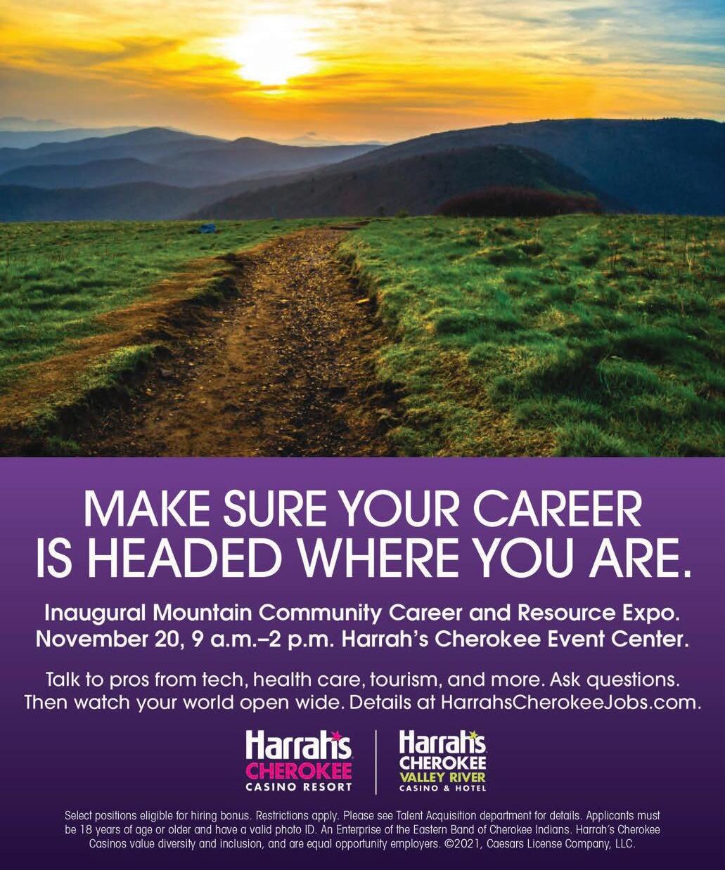 MOUNTAIN COMMUNITY CAREER AND RESOURCE Expo will be held from 9am-2pm on Saturday, November 20, at Harrah’s CheroConference Center, 777 Casino Drive, Cherokee, NC. Over 25 regional employers representing hospitality and tourism, technology, health care, manufacturing and professional services will showcase their career
