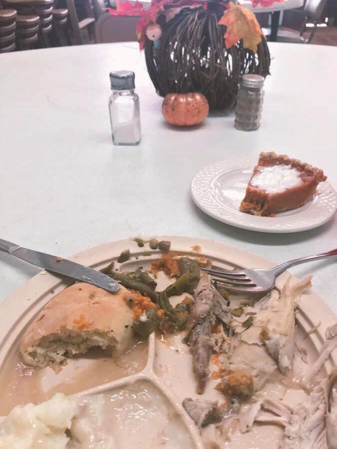 “Here we go!” he said, without hesitation. Once that plate was passed around behind the counter, I was handed a small mountain of turkey, green beans, mashed potatoes, gravy, a biscuit and a piece of pumpkin pie.