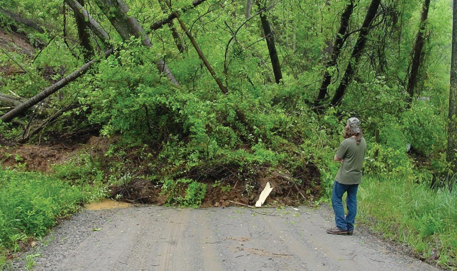 Alandslide east of Canton took out a dirt road early Monday morning following two solid days of unceasing rains, blocking about 40 people in their homes who had no other way to get out of their neighborhood.