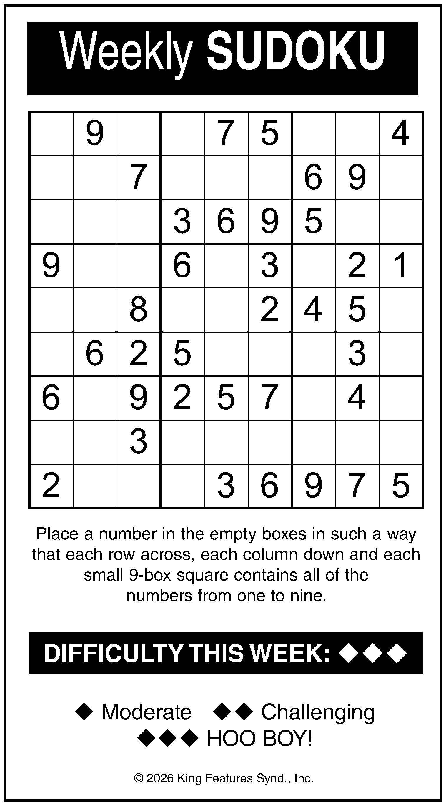 Here’s How It Works: Sudoku puzzles are formatted as a 9x9 grid, broken down into nine 3x3 boxes. To solve a sudoku, the numbers 1 through 9 must fill each row, column and box. Each number can appear only once in each row, column and box. You can figure out the order in which the numbers will appear by using the numeric clues already provided in the boxes. The more numbers you name, the easier it gets to solve the puzzle!