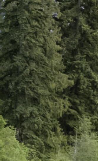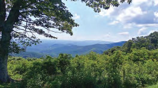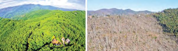 A drone photo above Elk Mountain in summer 2024, juxtaposed with drone photo after Tropical Storm Helene. The “blowdown” flattened an entire slope and downed trees are now potential fuel for wildfires.