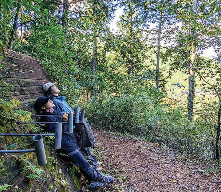 platform. The trail beyond the platform is steeper and more difficult but will take you to the top of one of the falls. A dirt incline leads to the bottom of the falls that you’d have to slide down. It looks like it would be a challenge to get back up.