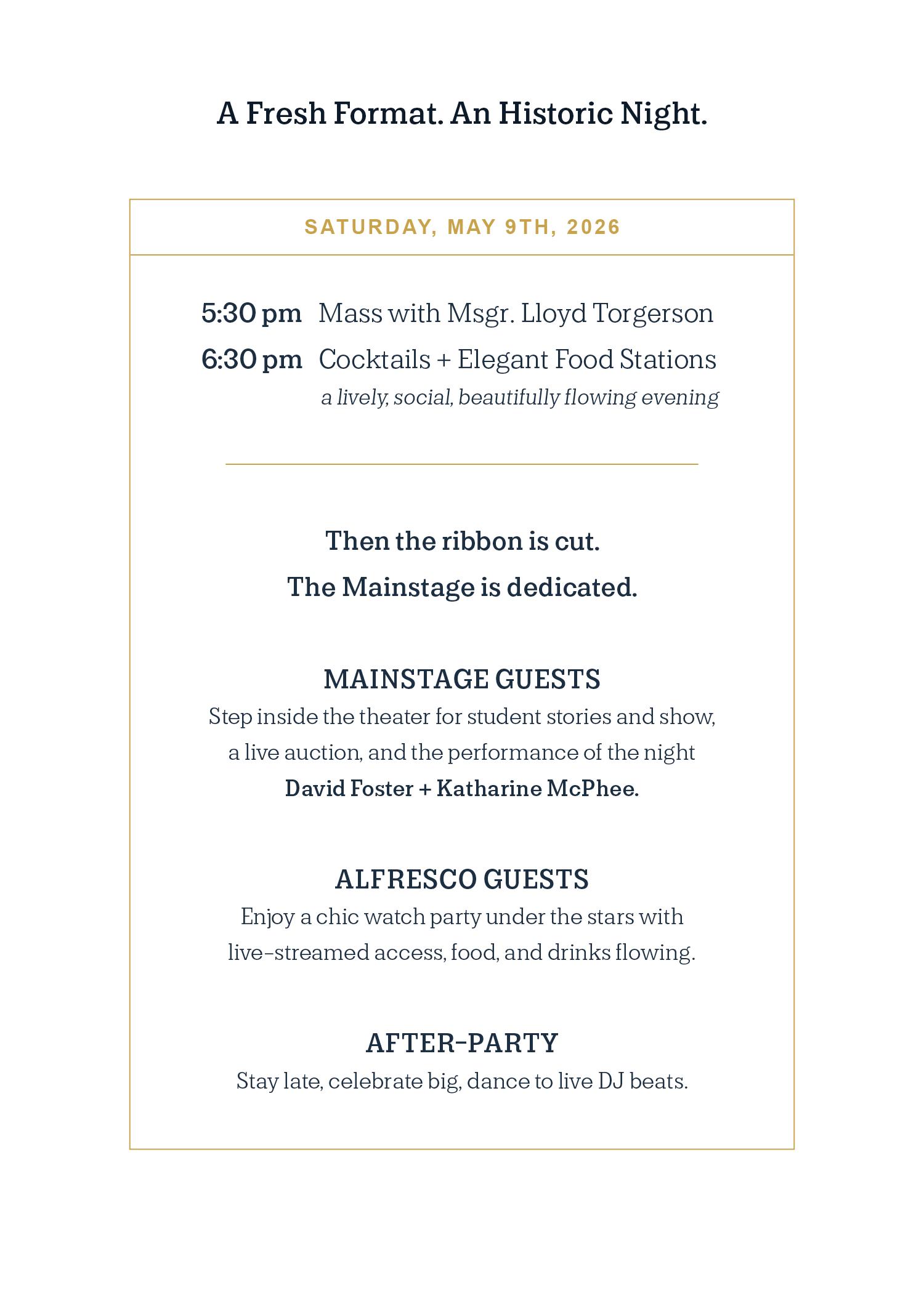 From Mass celebrated by Msgr. Lloyd Torgerson to chef-curated dining, student storytelling, and a live auction—this is more than a gala. It is a moment.