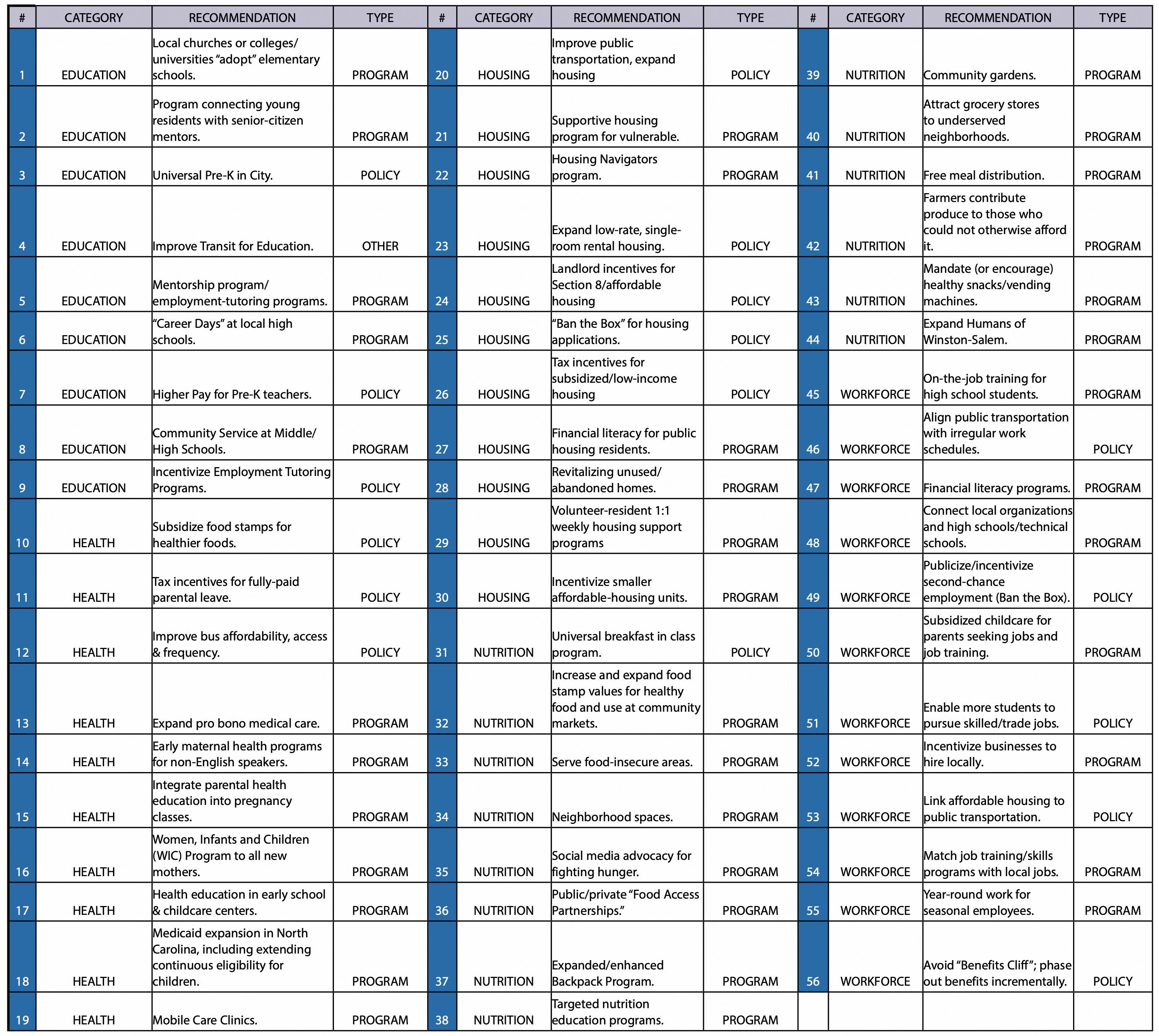 The Poverty Thought Force believes that the people of Winston-Salem and Forsyth County possess a collective will to bring our community back to a place where poverty is not a barrier to anyone's prosperity. That's why it delivered its report with 56 specific recommendations grouped around five aspects of poverty: education and life skills, health and wellness, jobs and workforce development, housing and homelessness, and hunger and food insecurity.