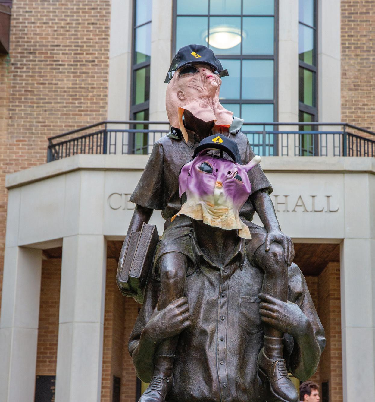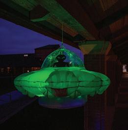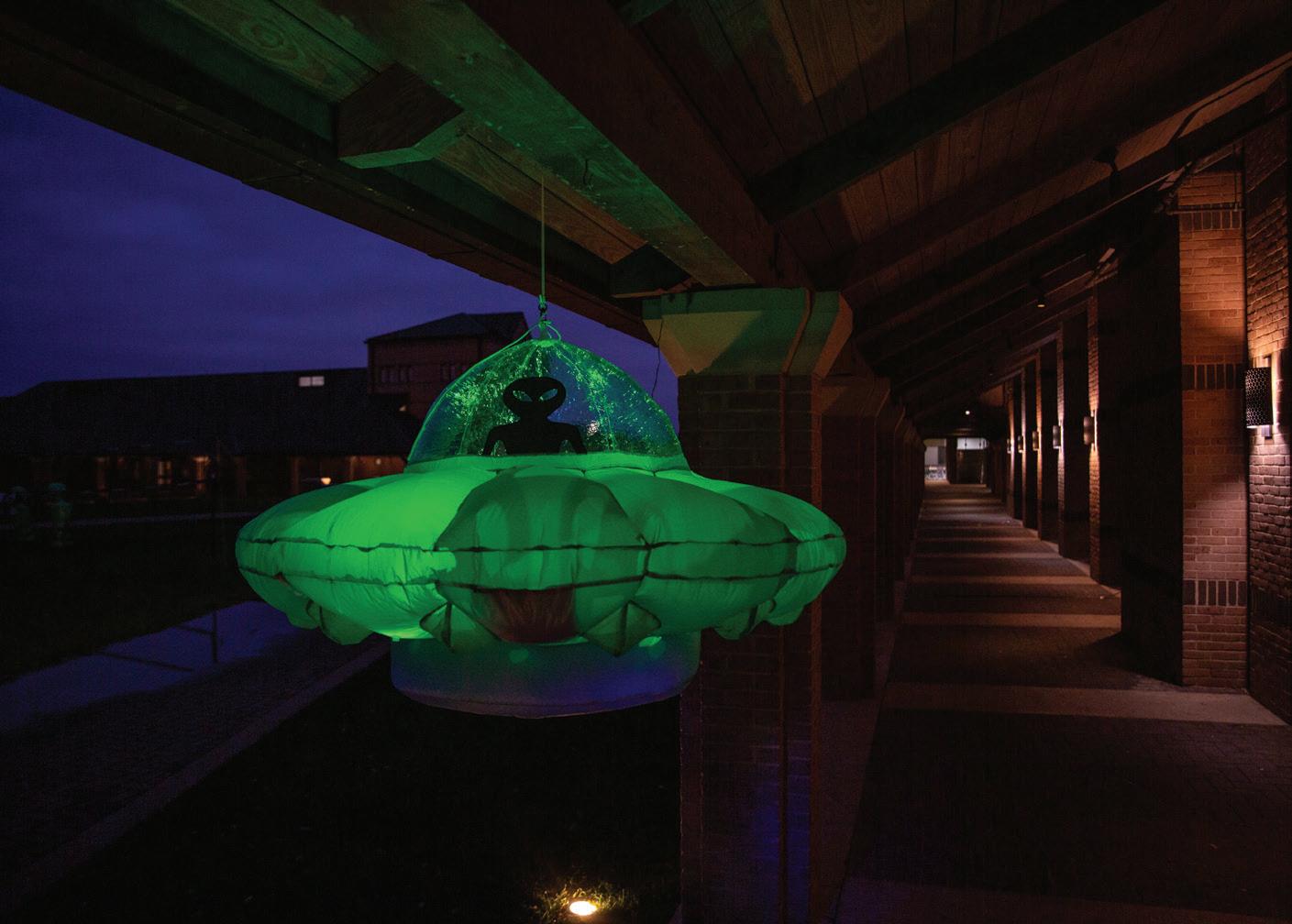 2. A group of students play a game of volleyball together on the quad. 3. A student jumps up in excitement after making it down the slide. 4. The two students on the statue outside of Centennial Hall have their faces covered with alien masks. 5. An alien drawn on the windows of the commons looks out on to passerby’s 6. An inflatable UFO hangs next to the walkway outside of the commons.