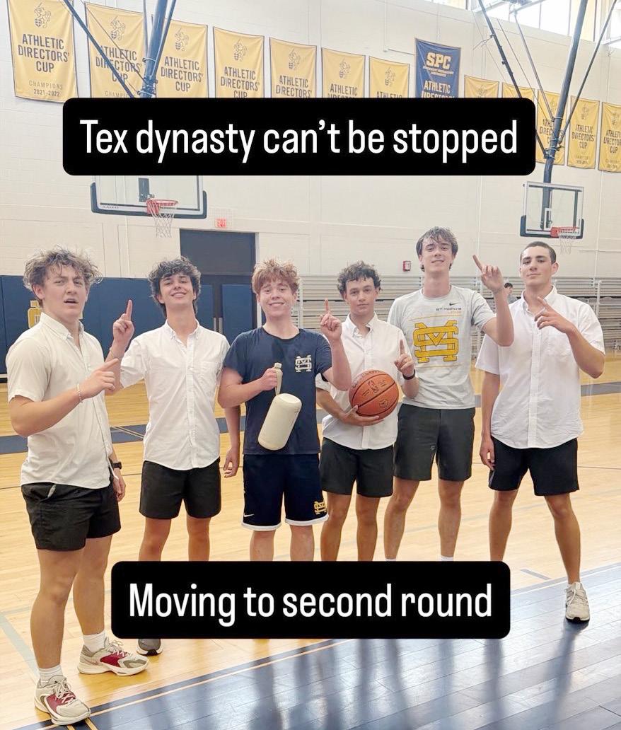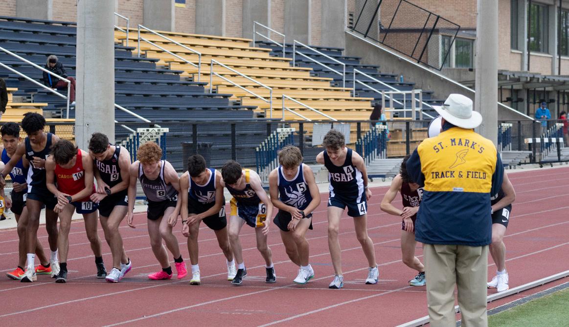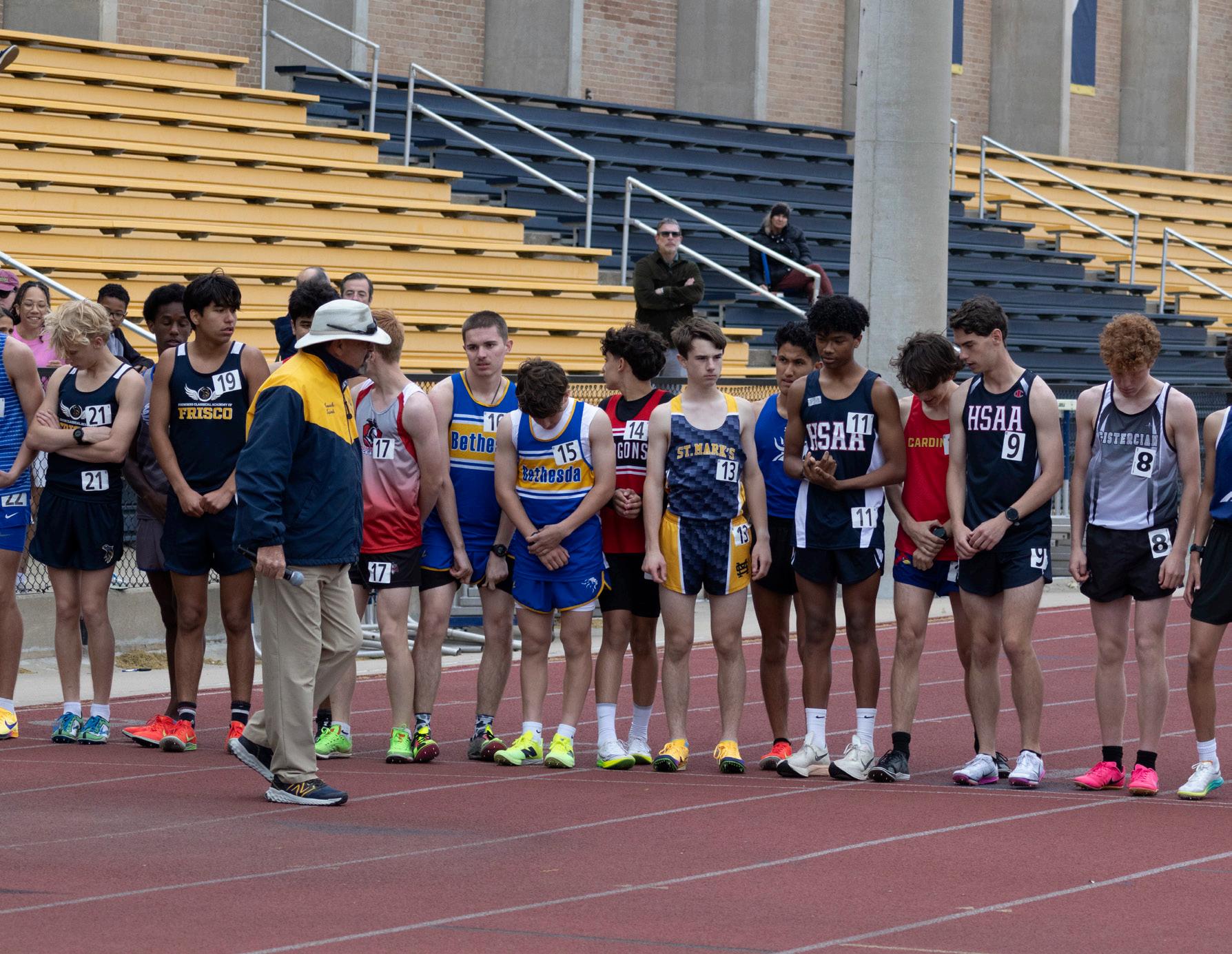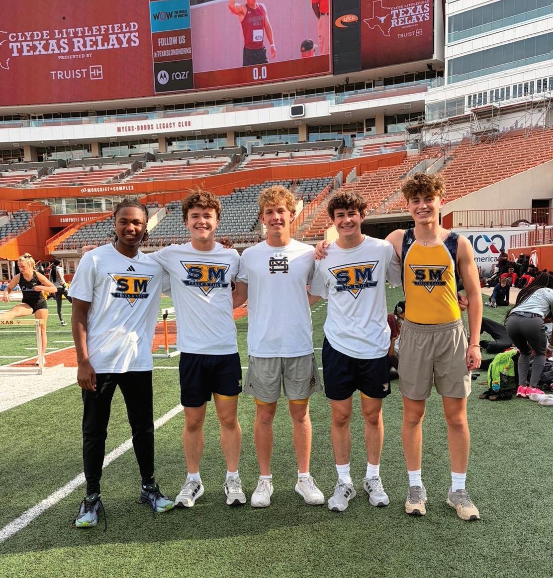Freshman Anderson Love (far right) stands with fellow sprinters Braden Scott (far left), Riggs Bean (left), Tripp Schoellkopf (middle), and Max Bean (right) at Texas Relays in Austin.