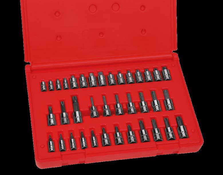 • Includes (5) 1/4" Drive Standard TORX® Bit Sockets, (7) 3/8" Drive Standard TORX® Bit Sockets, (7) 3/8" Drive Stubby TORX® Bit Sockets, (3) 3/8" Drive Triple Square Drivers, (7) 3/8" Drive Metric Hex Bit Sockets, (4) 1/4" Drive Stubby Metric Hex Bit Sockets and (4) 3/8" Drive Stubby Metric Hex Bit Sockets in a storage case