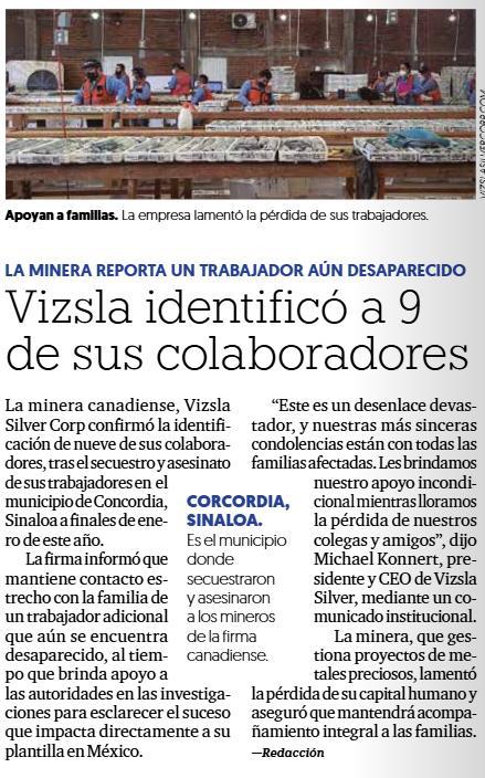 Por: Arlette Palacios CDMX El cuerpo de Miguel Tapia Rayón, uno de los 10 mineros privados de la libertad en enero pasado en el municipio de La Concordia, Sinaloa, fue identificado, informó la empresa canadiense Vizsla Silver mediante un comunicado oficial.
