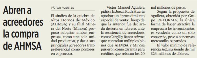 Luego de que en febrero pasado se declarara desierto el proceso de subasta, el síndico de la quiebra propuso un “procedimiento especial de venta” de Ahmsa y Minosa, que contempla dar trato preferencial a sus acreedores para que estos participen como postores interesados en la puja.