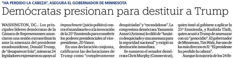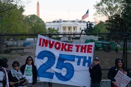 ▲ Frente a la residencia presidencial, activistas exigieron ayer que el Congreso aplique la Enmienda 25 al mandatario estadunidense, la cual posibilita la separación del cargo por “incapacidad”. En tanto, la vocera de la Casa Blanca, Karoline Leavitt, proclamó anoche que el acuerdo de cese el fuego es una victoria para Estados Unidos que “Donald Trump y nuestras increíbles fuerzas armadas hicieron posible”. Subrayó: “nunca se subestime la capacidad del titular del Ejecutivo para promover con éxito los intereses del país y negociar la paz”.Foto Ap