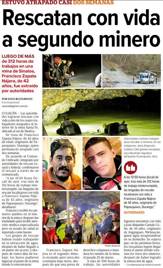 Con Zapata suman dos los obreros rescatados de la mina Santa Fe. El 30 de marzo salió José Alejandro Cástulo Colín, de 44 años, originario de Angangueo, Michoacán, quien durante cuatro días estuvo en oscuridad total y soportó temperaturas de hasta 30 grados, pero se mantuvo vivo gracias al oxígeno disponible en el ducto y a que pensaba en su familia. “Recordaba a mis hijas y en mi nieta de 8 años”, dijo. Su esposa Martha Pérez lo recibió y acompañó al hospital.
