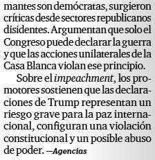 El senador demócrata socialista Bernie Sanders añadió que “dólares de los contribuyentes estadunidenses se emplean para violar masivamente la ley internacional y cometer un crimen de guerra mayor. Lo que hace Trump no sólo es inmoral, es el acto de un individuo trastornado padeciendo un narcisismo extremo”. Instó a sus colegas republicanos en el Congreso a sumarse al esfuerzo para frenar la guerra.