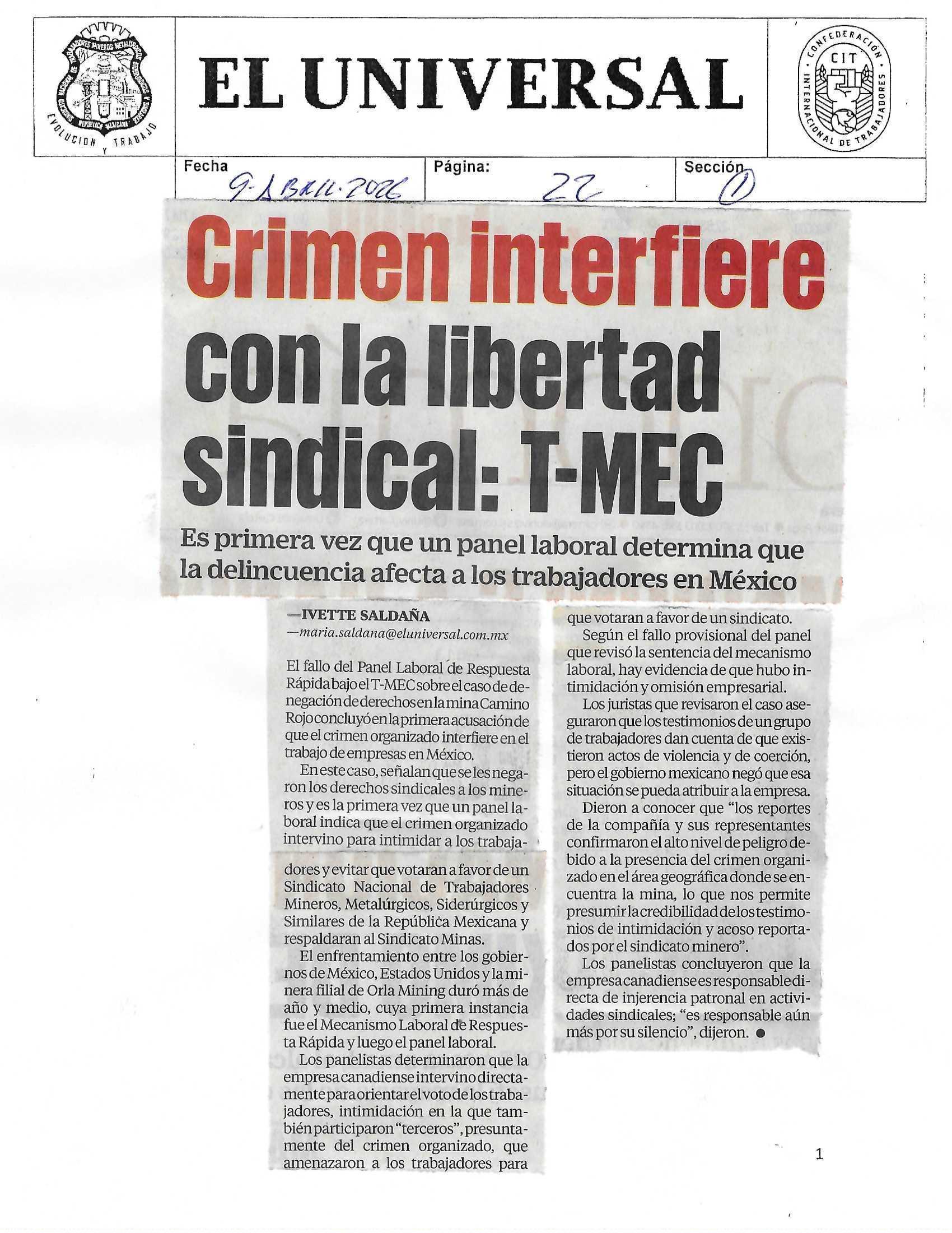 La minera Camino Rojo, ubicada en Zacatecas, utilizó al crimen organizado para amenazar a sus trabajadores, afiliados a la sección 335 del Sindicato Nacional Minero, y violar sus derechos laborales, además de buscar que desertaran de este gremio, advierte de forma inédita la investigación del panel del Mecanismo de Respuesta Rápida (MRR) del T-MEC, que determinó que la compañía es “responsable directa de injerencia patronal” en actividades sindicales. De acuerdo con la resolución preliminar, los expertos panelistas documentaron evidencias sobre los actos de violencia y amenazas de muerte, en asambleas sindicales y en sus domicilios, contra los trabajadores de la organización sindical que encabeza Napoleón Gómez Urrutia, titular del contrato colectivo, para obligarlos a afiliarse a un gremio de “protección” patronal de la Federación Nacional de Sindicatos Independientes.