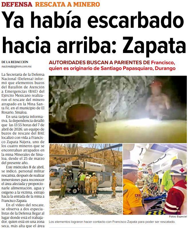Más tarde, el Comando Unificado dio a conocer que a ayer a las 10:, Francisco Zapata, originario de Santiago Papasquiaro, Durango, fue rescatado con éxito de la mina Santa Fe, tras permanecer dos semanas a 300 metros de profundidad.