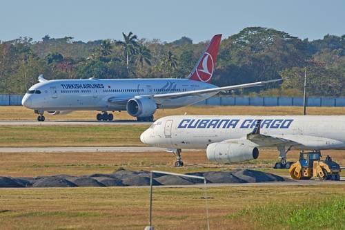 ▲ Un avión de pasajeros de Turkish Airlines se prepara para despegar ayer lunes junto a un avión de Cubana Cargo en el Aeropuerto Internacional José Martí de La Habana, donde aun no se percibe baja en la cifra de vuelos nacionales o internacionales.Foto Ap