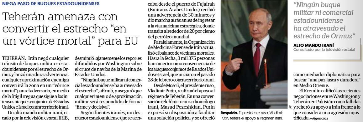 Trump también afirmó en su red social Truth Social que Washington interceptará a todos los buques en aguas internacionales que hubieran pagado peaje a Teherán y destruirá las minas que, según él, los iraníes colocaron en el estrecho, una vía marítima estratégica por la que transita alrededor de 20 por ciento del suministro energético mundial y que la república islámica mantiene bloqueada desde el comienzo de la guerra.