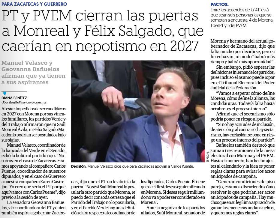 Por otra parte, apuntó que el PT no postulará al morenista Saúl Monreal para el gobierno de Zacatecas, quien por su lado dijo que esperará las definiciones del instituto político donde milita.