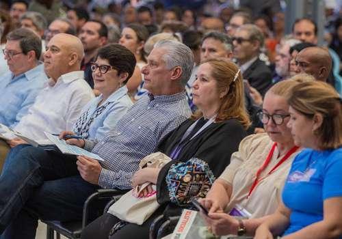 ▲ El presidente cubano, Miguel Díaz-Canel, asistió al quinto Coloquio Patria, que rinde homenaje al centenario de Fidel Castro; lo acompaña, a su izquierda, la periodista e investigadora Rosa Miriam