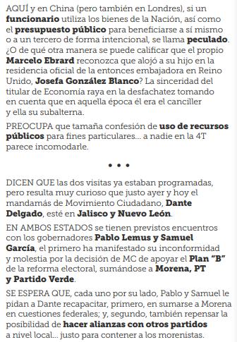 Respecto a un cambio con la dirigente morenista, afirmó que “son rumores”, y a pregunta expresa sobre incorporar a Alcalde a su gabinete, respondió: “todavía no hay nada en particular. No hemos avanzado en ello. Si hay algún cambio, yo les avisaré”, pero precisó que sobre los temas particulares de Morena deben responder en el partido.