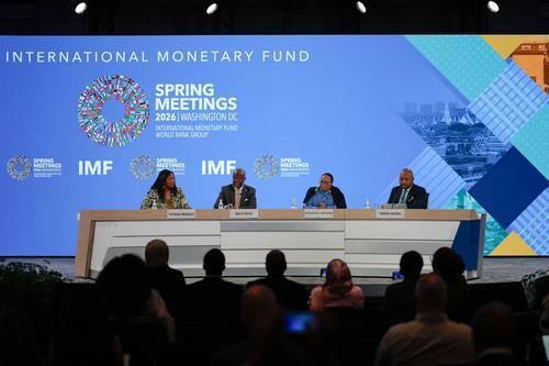 ▲ Tatiana Mossot, directora de comunicación del Fondo Monetario Internacional; los ministros de Finanzas de Nigeria, Wale Edun; Lesoto, Retselisitsoe Matlanyane, y República Centroafricana, Hervé Ndoba, durante un debate entre funcionarios de países africanos, en las Reuniones de Primavera del FMI y el Banco Mundial, ayer en Washington.Foto Afp