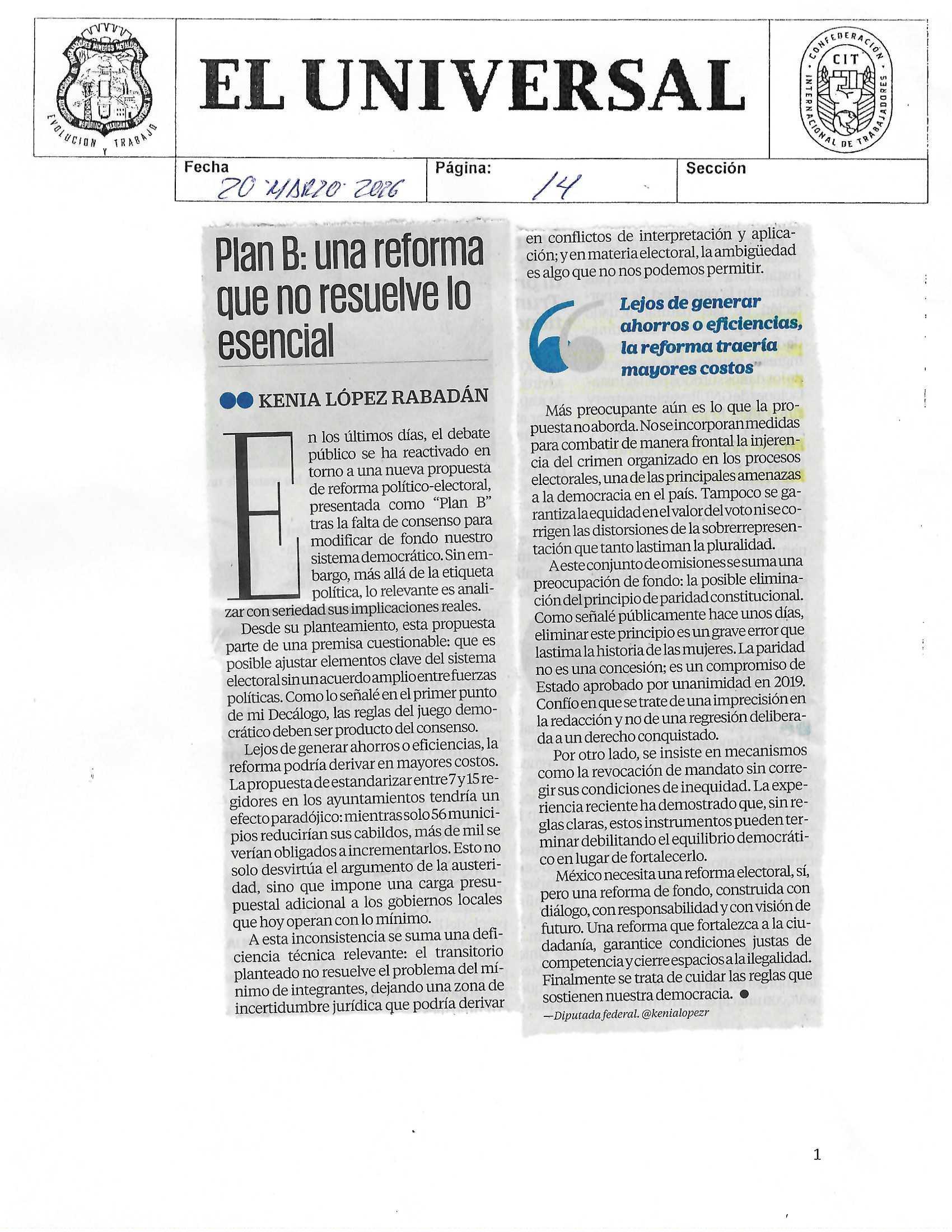 Periódico La Jornada Viernes 20 de marzo de 2026, p. 14