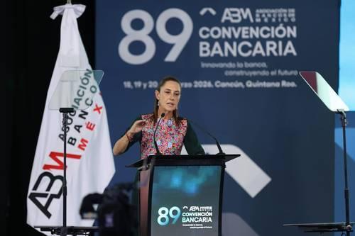 Periódico La Jornada Viernes 20 de marzo de 2026, p. 13 Cancún, QR., La presidenta Claudia Sheinbaum Pardo hizo un llamado a “trabajar juntos en los temas en que sí estamos de acuerdo”, en un discurso pronunciado ante representantes del sector financiero, empresarial y legisladores de la coalición gobernante y la oposición. Al inaugurar la 89 Convención Bancaria, la mandataria planteó que “estamos viviendo momentos difíciles en el mundo”, por el recrudecimiento de la escalada bélica en el Medio Oriente.