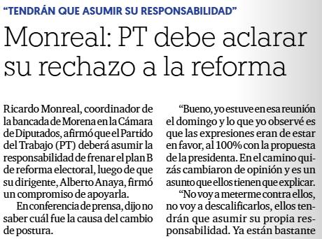 Antes, Mier no quiso precisar si cuentan con los votos del PT, sin los cuales no logran la mayoría calificada. Pidió no adelantar vísperas y recalcó que este partido “es un aliado incondicional” y están trabajando en ese sentido, pero dejó claro que no se hará ninguna modificación en el tema de revocación de mandato, tal como lo expresó ayer la Presidenta de la República en su conferencia matutina, y sólo se ajustará lo referente a la conformación de los ayuntamientos.