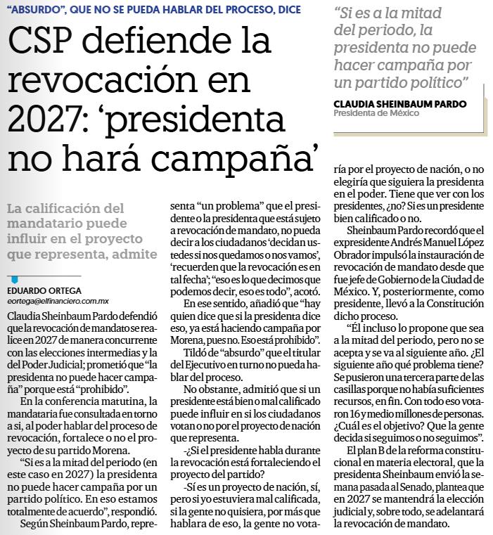 La presidenta Claudia Sheinbaum se pronunció porque la revocación de mandato se realice en 2027, aun cuando la iniciativa que envió al Senado plantea que pueda ser ese año o el siguiente.