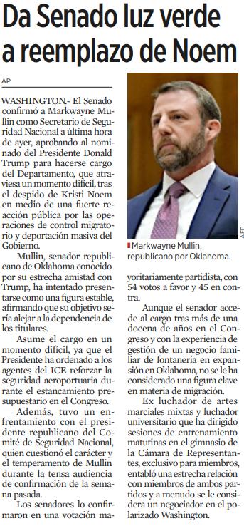 Por otra parte, y tal como se esperaba, el Senado confirmó a Markwayne Mullin como secretario de Seguridad Nacional, quien fue nominado por Trump para tomar las riendas de esa agencia tras el cese de Kristi Noem. @lajornadaonline reportó que si bien el magnate cambia personal y suaviza los mensajes antimigrantes por críticas, continuará la cacería de indocumentados, el envío a centro de detenciones y las expulsiones https://shorturl.at/9fGjA