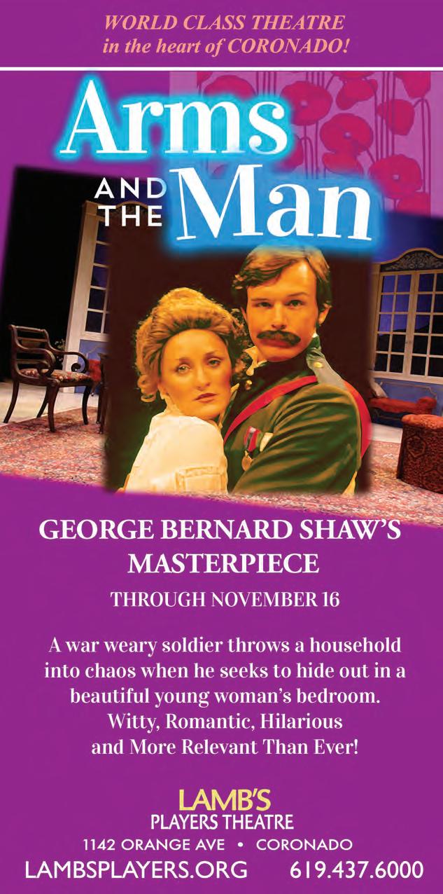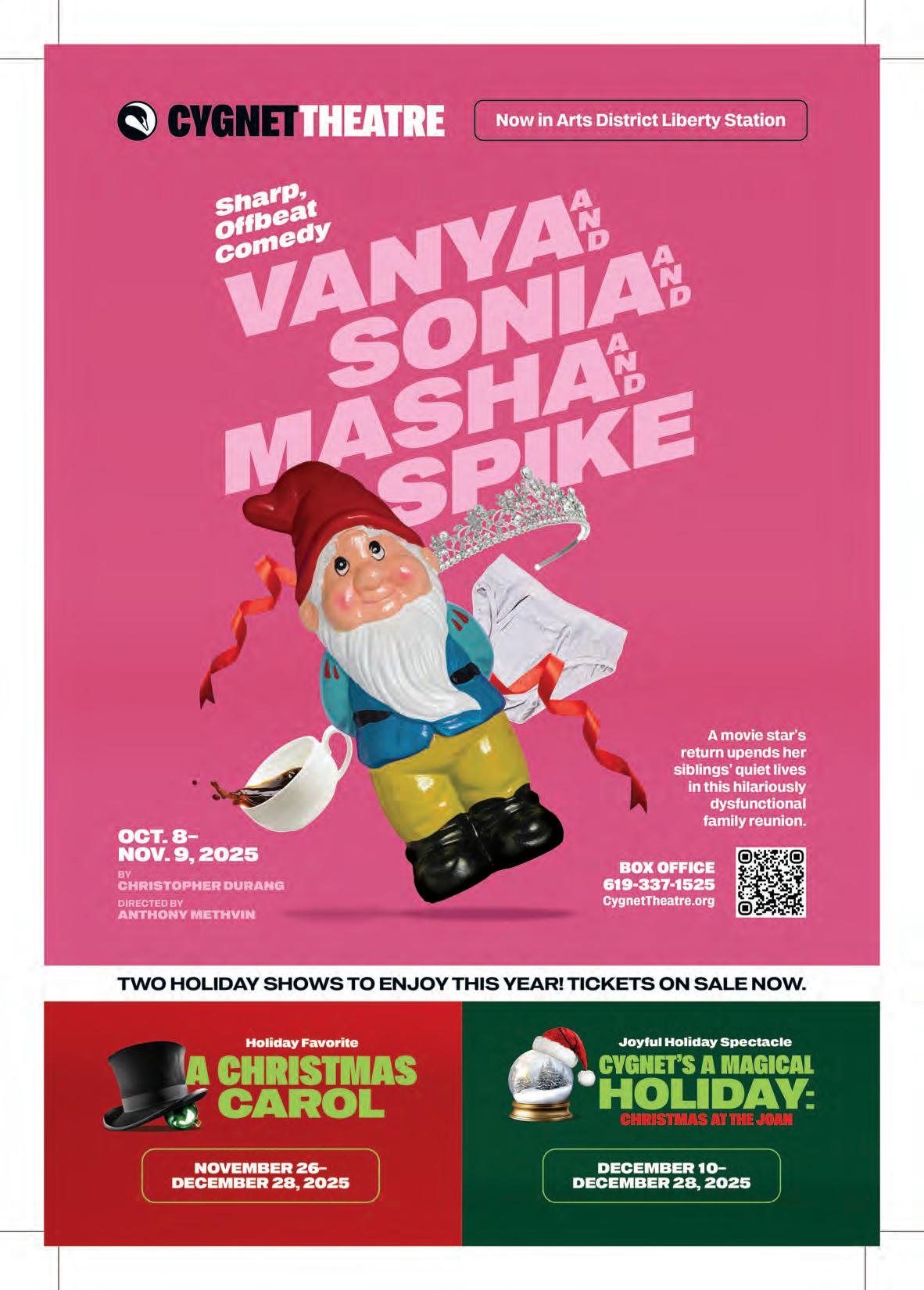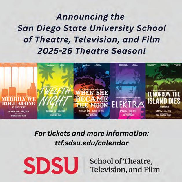 “THERE’S LIFE AFTER Romeo.” Spoiler alert: This updated version of Shakespeare’s epic tale, Romeo & Juliet, comes with quite the plot twist. Presented by Broadway San Diego at the Civic Theatre Oct. 14-19, & Juliet is a musical comedy that is essentially a “play within a play,” exploring what would happen if Juliet were to choose her own fate instead of dying for her Romeo— interwoven with pop music hits and hip-hop choreography. broadwaysd.com The Old Globe stages the West Coast premiere of SMALL, Sept. 27-Oct. 19; and the world-premiere musical, Huzzah!, through Oct. 19. The latter—with book, music and lyrics by Nell Benjamin and Laurence O’Keefe, and directed by Annie Tippe—invites you to grab a turkey leg and cinch thy corset for “a midsummer night’s screamingly funny musical.” The story centers on two sisters, who stop fighting long enough to hire the greatest swordsman around, in order to save their father’s Renaissance Faire from financial ruin. theoldglobe.org