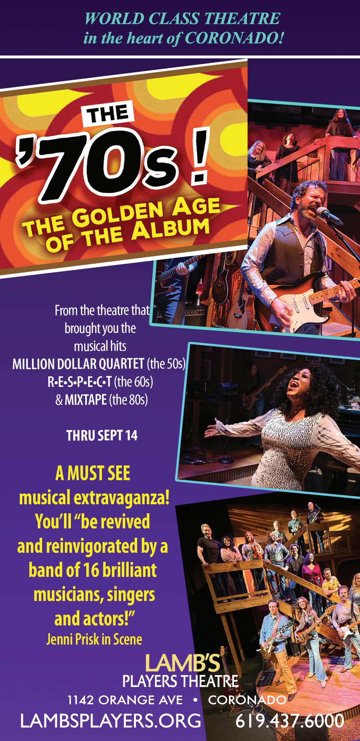 IF YOU recognize Andrew Polec in A Gentleman’s Guide to Love and Murder running at North Coast Rep through Aug. 17—you likely have seen Dr. Seuss’ How The Grinch Stole Christmas at The Old Globe. (The grumpy green guy, perhaps?) In A Gentleman’s Guide... (winner of the 2014 Tony Award for “Best Musical”), Polec portrays Monty—a poor but ambitious nobody ho-humming his way through early 1900s London as a clerk. When Monty’s mother passes away, he learns he is ninth in line to become Earl of Highhurst. Mysteriously, his family members begin to die off in morbidly hilarious ways. northcoastrep.org Lamb’s Players Theatre presents THE ‘70s! — The Golden Age of the Album, written by Kerry Meads and Vanda Eggington, running through Sept. 14. Channel your ‘70s music nostalgia via a dazzling ensemble cast performing hits of the era. lambsplayers.org