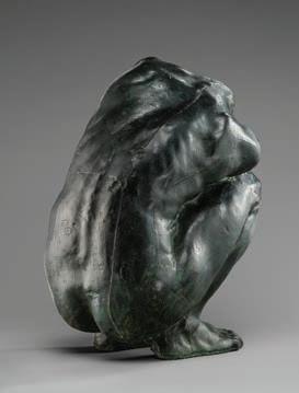 Top: Camille Claudel at work, circa 1903. Left to right: Claudel’s bronze Torso of a Crouching Woman (modeled ca. 1885, cast ca. 1913), terracotta Young Girl with a Sheaf (1887) and plaster Man Stooping (ca. 1886).