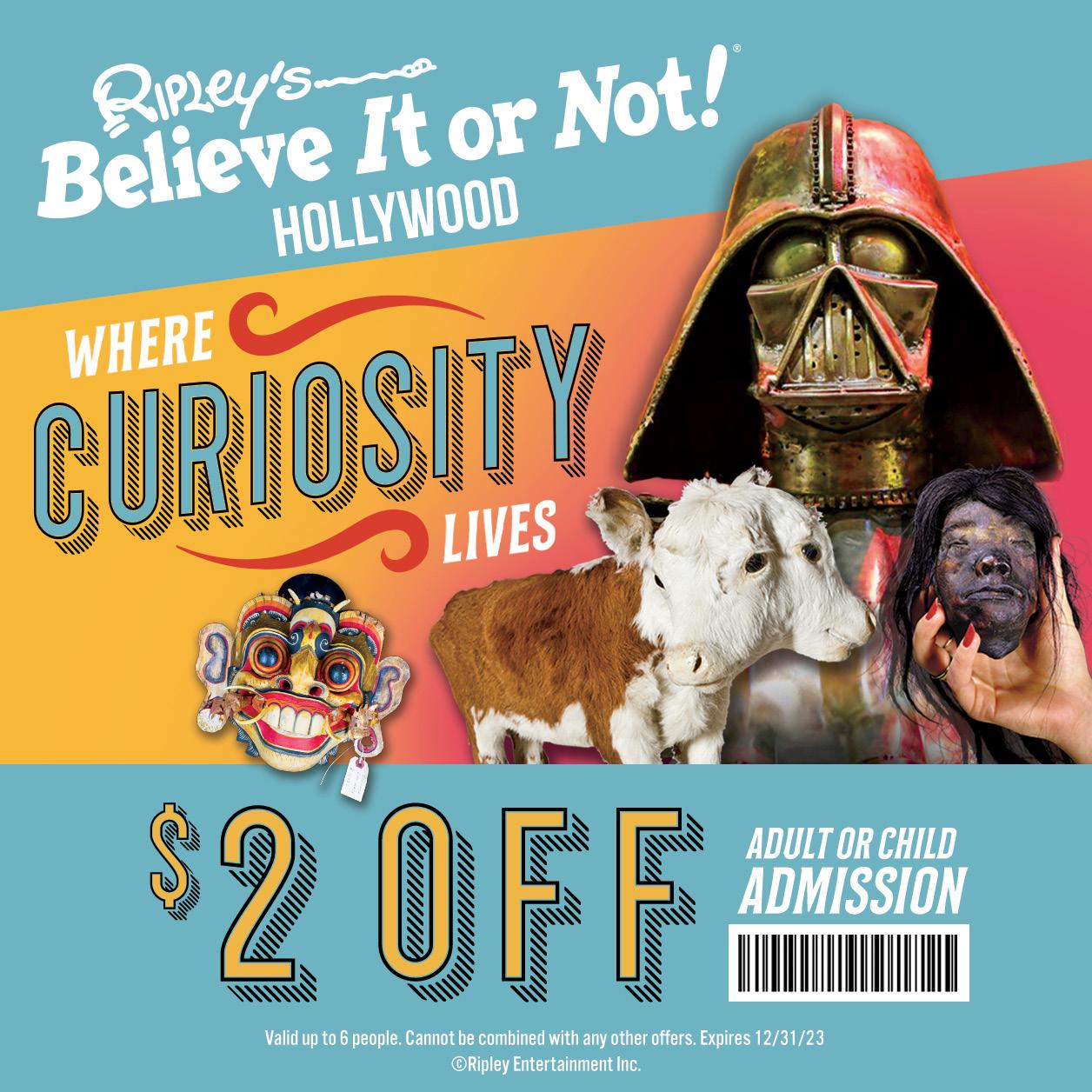 RIPLEY’S BELIEVE IT OR NOT! ODDITORIUM Three hundred displays feature curiosities gathered by traveler Robert Ripley in the 1930s. M-Th 11 am-8 pm., F-Sa 10 am-10 pm, Su 10 am.8 pm. $10-$15, under 3 free. 6780 Hollywood Blvd., Hollywood, 323.466.6335 Map H13